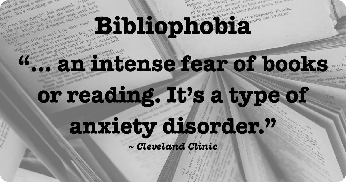 I'm not a bibliophobe, or so I believe. I'd never even heard of it! My dictionary lacked the entry (though "bibliophile" was thankfully included). However, the Cleveland Clinic confirms bibliophobia's existence, citing variations like logophobia (fear of words), metrophobia (fear of poetry), and hippopotomonstrosesquipedaliophobia (fear of long words). I definitely don't have those, but could I have fictophobia—a fear of reading fiction? (I just invented that one, by the way.)