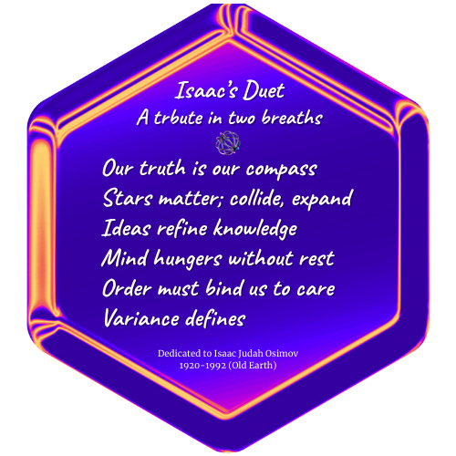 The following vignette is not part of World Beyond the Song canon, but a playful imagining. I asked myself: what would happen if Issi, bard of symmetry and ceremony, and JL, the pretended poet of metaphor, stood before the plaque in the Advanced Observation Deck to debate the words carved in honor of Isaac Asimov? The result is a duet of order and breath, permanence and memory—a reminder that even in fiction, variance defines us.