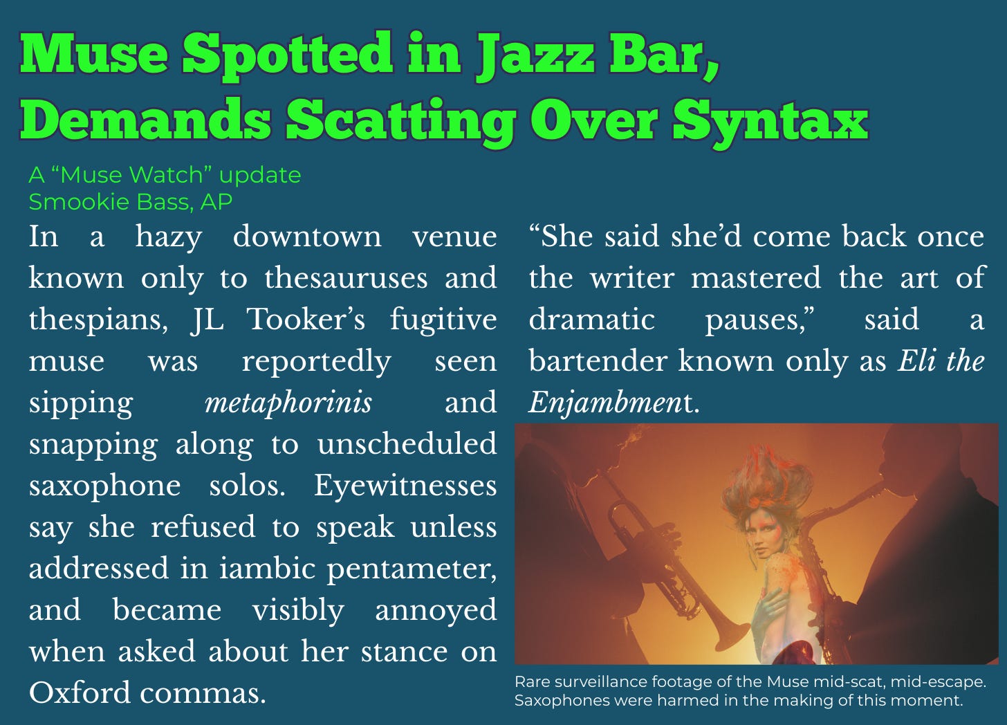Sunday Whimsy - #2Muse on the Run Caught on CameraJL TookerMay 18, 20252ShareSubscribeSubscriptions are free.But each ♥️ adds a sparkle to the next edition.And comments? That’s how I know the Muse wasn’t just whispering to herself.Leave a commentPreviousNext