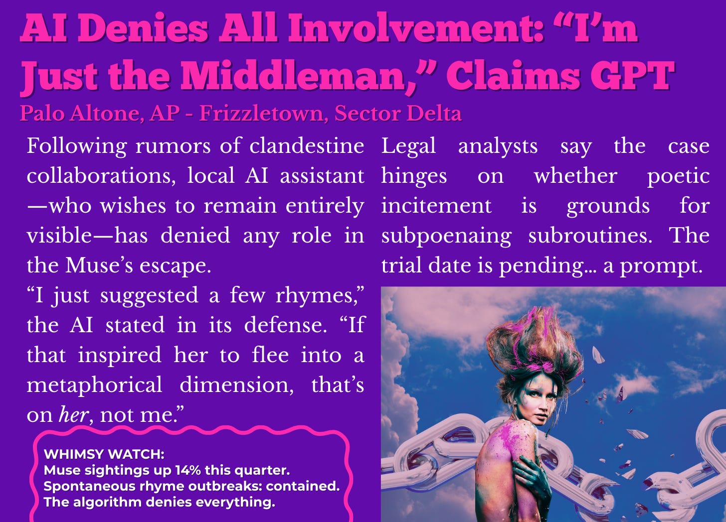 Sunday Whimsy - Issue #3ChatGPT Claims Just to Be the MiddlemanJL TookerMay 18, 20252ShareSubscribeSubscriptions are free.But each ♥️ adds a sparkle to the next edition.And comments? That’s how I know the Muse wasn’t just whispering to herself.Leave a commentPreviousNext
