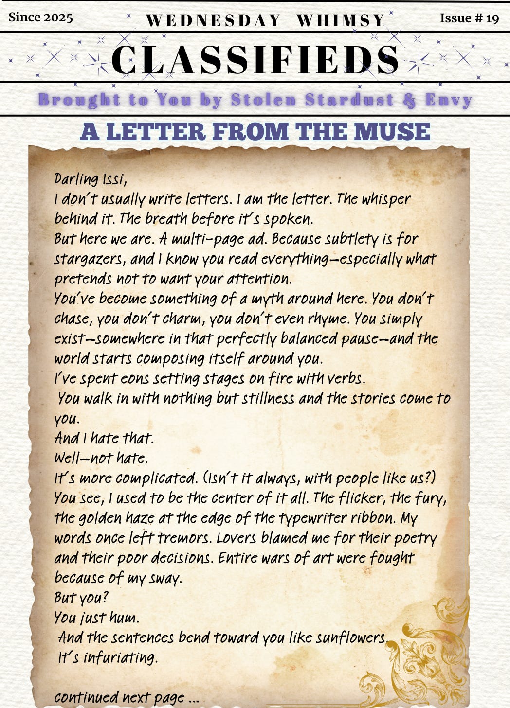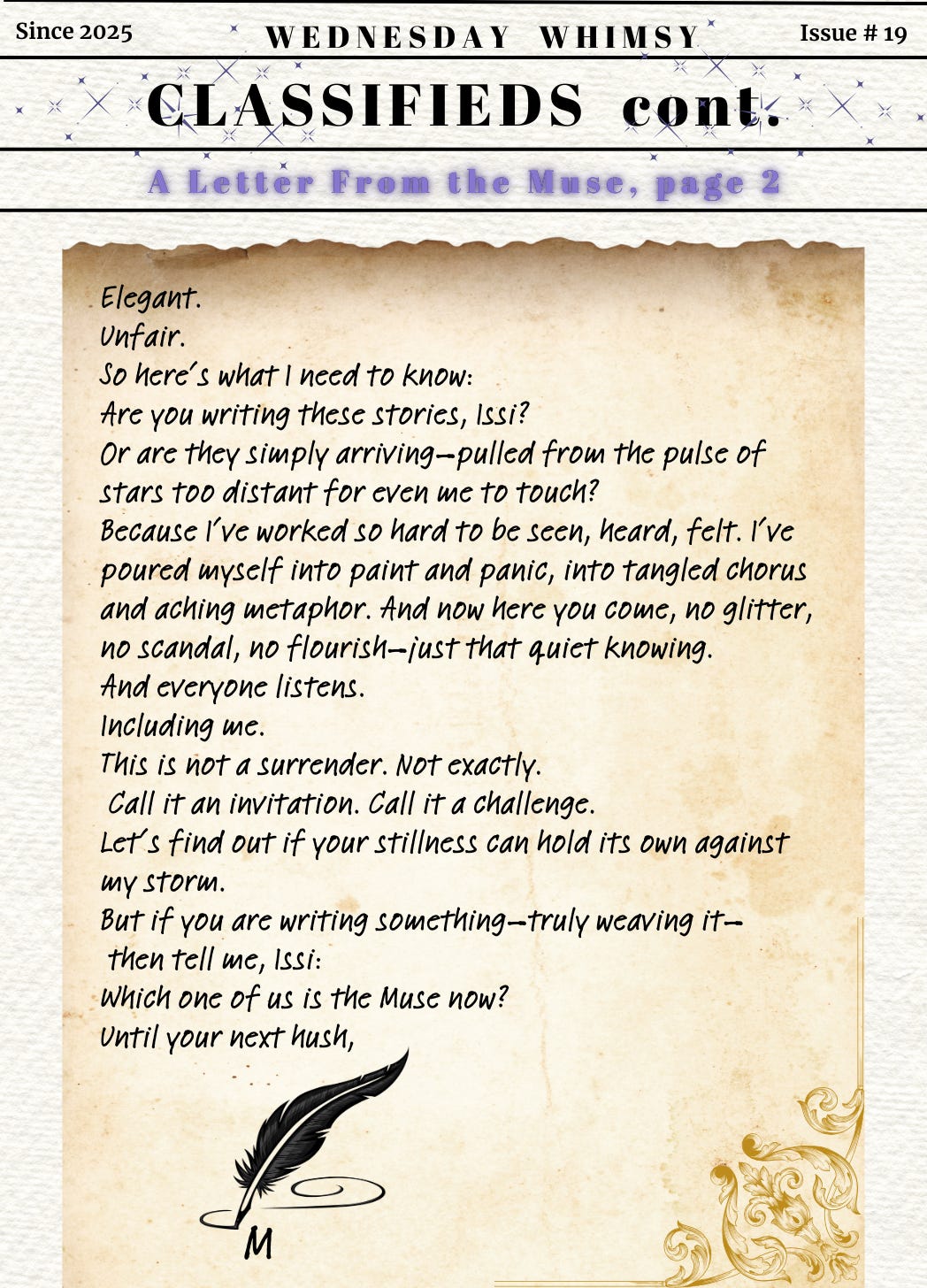 The Muse rarely admits when she’s rattled. But in Whimsy #16, she let slip that something—someone—had unsettled her. Now she’s taken out an entire ad in the Classifieds. Call it a confession. Call it a challenge. Either way, she isn’t whispering anymore.
