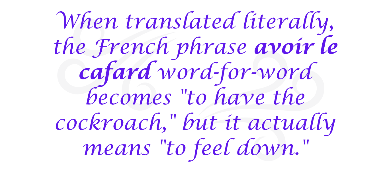 Idioms, metaphors, and slang don’t translate literally—nature of the beast. It’s not unusual for an AI to render an idiom word-for-word rather than capture its meaning. When translated literally, the French phrase avoir le cafard word-for-word becomes "to have the cockroach," but it actually means "to feel down." The emotion of cockroaches, or the cockroaches of emotion? Either way—AI’s not laughing.