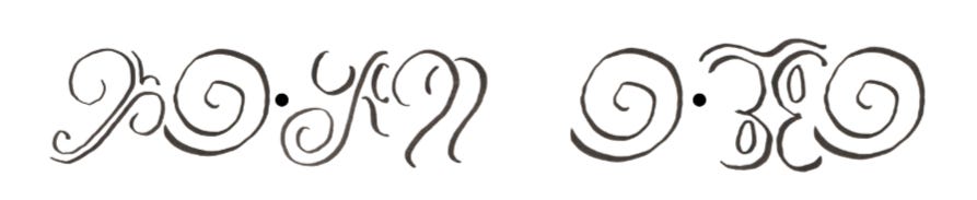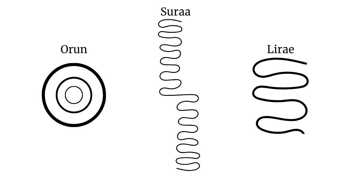 The glyph above represents the syllable ‘a’ in Threlraan. All threls are made from six base components. In the ‘a’ syllable above we find three constituents: orun, suraa, and lirae. (Note the images are not matching in scale).